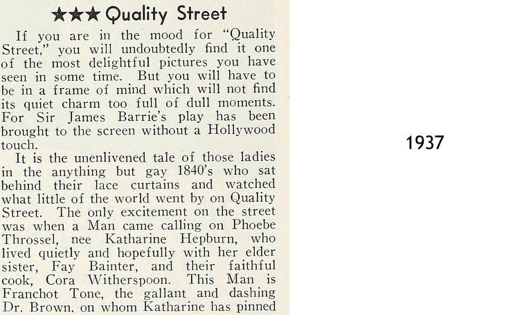 Next up is a two part review of the 1937 film, QUALITY STREET....featuring Croton notable Fay Bainter and starring Katharine Hepburn. Bainter's performance was very well received.