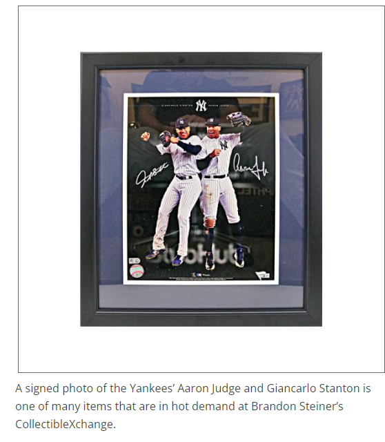 EXAMINER NEWS---Westchester Sports Collectible Maven is in His Glory With Yanks-Dodgers Series--October 24, 2024---Martin Wilbur--A signed photo of the Yankees’ Aaron Judge and Giancarlo Stanton is one of many items that are in hot demand at Brandon Steiner’s CollectibleXchange. For New York baseball fans, 2024 has been a year to remember. Between the surprise post-season run from the Mets and the Yankees’ first World Series appearance in 15 years, it has been a special time. MORE AT Westchester Sports Collectible Maven is in His Glory With Yanks-Dodgers Series | The Examiner News