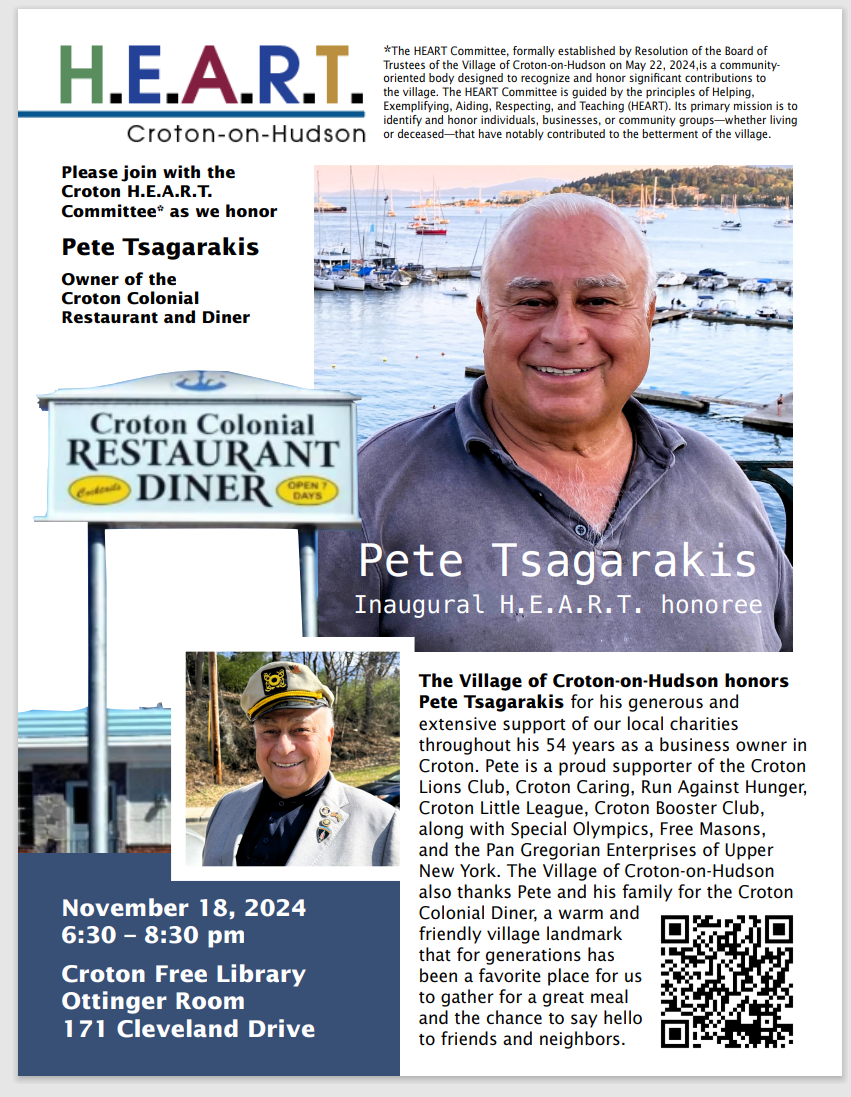 PLEASE JOIN WITH CROTON HEART COMMITTEE AS WE HONOR PETE TSAGARAKIS, CROTON COLONIAL RESTAURANT AND DINER. CLICK ON THE IMAGE FOR MORE DETAILS 11/18.